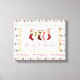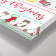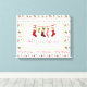 Arte de tela con un patrón repetido en el fondo, en un desagradable estilo de suéter Navidad. El patrón está compuesto de medias, bolas de navidad, estrellas y copos de nieve. Con repetir el texto de Feliz Navidad en rojo. Divertido y festivo. Encima hay un rectángulo blanco con un falso borde de Relieve metalizado dorado, dentro hay un ilustracion de medias antiguas colgadas y el texto: Feliz Navidad.