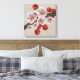 Flores blancas con centros rojos adornan una rama marrón, contrastando con un fondo neutral. Los pétalos son delicados, con estambres finos y amarillos que llegan al exterior.