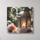 Bonita linterna floral ornamentada con una vela iluminada en un jardín primaveral lleno de rosas rosas rosas y blancas.