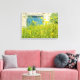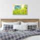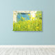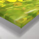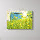 Flores de acuarela amarillas en flor con puerta de madera azul y pared de piedra