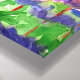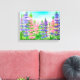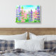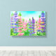Una pintura de tela envuelta decorada con un jardín de pinos rosados y púrpura pintado con acuarela acentuada por hojas verdes y un cielo azul cálido. ¡Bonito arte floral para tu casa u oficina!