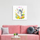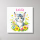 Arte de inteligencia artificial que representa un lindo gatito gris rayado sentado en un ramo de hermosas flores amarillas, rosadas y azules. Agrega el nombre de tu hijo en el área de personalización. Hermoso arte mural en acuarela para el cuarto o dormitorio de un niño.