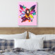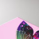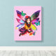 Un hadas joven con las vibrantes alas multicolores se arrodilla con gracia, rodeado de mariposas flameantes. Está adornada con un traje colorido con flores que le acentúan el pelo y tiene una delicada flor en la mano. Fondo rosa sólido