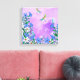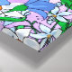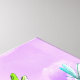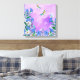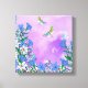 Hermosas flores azules y blancas sobre un fondo susurro morado con libélulas coloridas.