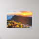 Esta asombrosa foto de Getty Images muestra plantas florecientes sobre rocas en el pico de Pico de la Zarza bajo el cielo ardiente al amanecer, Fuerteventura, Islas Canarias, España