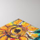 Expresivo , caprichoso gato negro , girasoles coloridos y hojas verdes en colores amarillo y azul turquesa. Pintura de acrílico original artística y vibrante en el panel de madera de Bulgan Lumini (c)