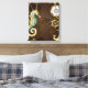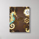 Fondo de madera marrón con mar, cresta mecánica, volante antiguo, ancla dorada y varios engranajes de oro y latón. Estilo Steampunk.