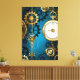 fondo turquesa, texturado, de vapor punk con bronce y oro, llave de plata y reloj. Estilo Steampunk.
