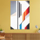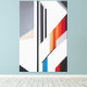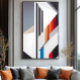 Las líneas angulares y las formas geométricas se entrelazan en un juego de colores y texturas. Tonos neutros como el diálogo blanco, gris y negro con rojos vibrantes, azul profundo y gradientes cálidos, creando una composición que respira modernidad y energía. Cada elemento parece moverse en armonía, transformando el espacio en una etapa de creatividad, ideal para ambientes que buscan sofisticación y dinamismo.