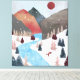 Un hermoso paisaje con texturas únicas que muestran un paisaje de río y montaña con un zorro en caza de salto medio en la nieve en tonos rojos, verdes, azules y beige.