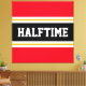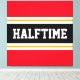 Este diseño deportivo y atlético presenta texto HALFTIME en negrita dentro de una banda negra ancha resaltada con doble franjas de carreras blancas contra rayas exteriores brillantes rojas. El texto de este diseño se puede personalizar.