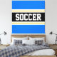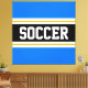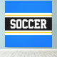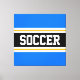 Este colorido diseño deportivo presenta el texto en negrita de SOCCER dentro de una amplia franja central horizontal negra con rayas de carreras blancas y amarillas doradas contra rayas exteriores de color azul brillante. El texto se puede personalizar.