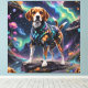 Ein Beagle in einem funkelnden, galaktischen Outfit läuft durch eine beeindruckende, kosmische Landschaft. Geschmückt mit Sternen und nebelartigen Mustern, verbindet dieses Bild Abenteuerlust mit interstellarer Magie.