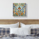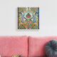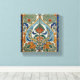 Floral pattern with symmetrical design, featuring stylized flowers and leaves in green, orange, and blue, with a border of dark blue and green.