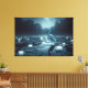 Garza blanca de pie en medio de nenúfares blancos brillantes iluminados por una luz etérea bajo un cielo estrellado.