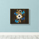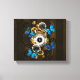 Composición de reloj de vapor redondo con dial numérico romano negro, decorado con arcos de oro y latón, mariposas morfo azules y lentes dañadas sobre fondo rayado marrón. Estilo Steampunk.