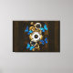 Composición de reloj de vapor redondo con dial numérico romano negro, decorado con arcos de oro y latón, mariposas morfo azules y lentes dañadas sobre fondo rayado marrón. Estilo Steampunk.