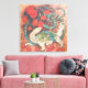 With visual depth reminiscent of ancient temple murals, Genbu emerges amid tranquil greens and blues, dramatically contrasted by vibrant red blossoms that embody life, strength, and spiritual fire.