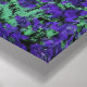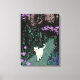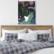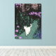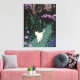 Un gato blanco camina por un camino en un bosque antiguo, rodeado de flores moradas y hierba verde, con árboles negros y flores rosas. El fondo es verde y el ilustracion presenta un estilo muy contrastante inspirado en el Tatsuro Kiuchi.