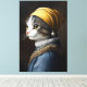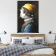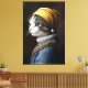 Esta obra de arte es una reinterpretación lúdica y creativa de la famosa pintura "Chica con Perla" de Johannes Vermeer. En esta versión, la figura es retratada como un gato elegante con una mirada suave y expresiva, adornado con un velo amarillo y una sola perla pendiente. Las texturas realistas de la piel, la ropa y los accesorios mezclan técnicas de pintura clásica con un peculiar giro animal, creando una fusión única de arte y fantasía.