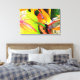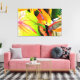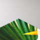 color brillante, foto de lagarto verde en ave del paraíso y flores de anturio con crotón brillante y hojas de palma plegadas en el fondo