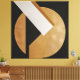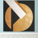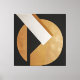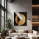 Una composición abstracta que fusiona un círculo dorado, un triángulo oscuro y una franja blanca en elegante contraste. La obra de arte transmite equilibrio entre fuerza y sutileza, explorando el diálogo de formas geométricas, luz y sombra, evocando modernidad y sofisticación atemporal.