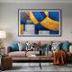 Composición abstracta moderna que combina formas geométricas curvas y cuadradas. Textura de hormigón desgastado en tonos azul profundo, dorado mostaza y gris. Ideal para decoración industrial o contemporánea. Arte que une precisión geométrica con rusticidad urbana y elegancia.