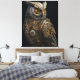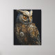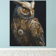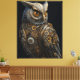 A majestic steampunk owl stares forward with intense golden eyes, its face and body an elaborate fusion of brass gears, copper plates, riveted metal, and layered feather textures. Sharp mechanical ear tufts rise above the detailed head while intricate clockwork covers the chest and wings in rich metallic tones. This dramatic three-quarter portrait against a deep black background blends Victorian engineering with avian power, creating a striking piece of industrial fantasy art. Perfect for canvas prints, posters, phone cases, mousepads, throw pillows, and décor that adds bold steampunk character to any space.