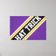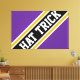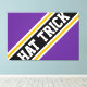 Este diseño deportivo de hockey presenta el texto del GORRA atlético TRICK dentro de bandas de carreras anchas diagonales en negro, blanco y amarillo dorado contra fondo púrpura real. Las letras primera y última del texto salen de los bordes de diseño con un efecto de pancarta dinámico. Los colores y el texto de este diseño se pueden personalizar.