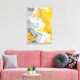The artwork utilizes expansive areas of pure white to enhance the luminosity of the yellow, while the grey adds depth and sophistication. Scattered splatters and droplets across the surface add texture and maintain the spontaneous, liquid feel of the piece. The overall effect is a highly modern and powerful statement piece that draws inspiration from the current trend of using vibrant accents against neutral tones.
