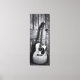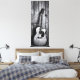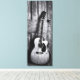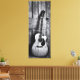 Una impresionante fotografía en blanco y negro de una guitarra acústica que descansa sobre una puerta de madera templada. El contraste entre los ricos tonos de madera y el fondo texturado crea una obra de arte atemporal ideal para músicos, amantes de la guitarra y para todo aquel que se sienta atraído por la belleza de los instrumentos musicales clásicos.