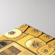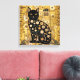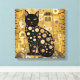 Este diseño es un ilustracion estilizado de un gato negro de la manera artística de Gustav Klimt. El gato está instalado en una zona de descanso, adornado con motivos y motivos decorativos intrincados que recuerdan el estilo característico de Klimt, con formas geométricas, elementos florales y diseños circulares. El fondo cuenta con una superficie dorada y texturada con follaje estilizado y flores, lo que realza aún más la estética de Klimt-esque. La impresión general es de elegancia ornamental y riqueza decorativa, mezclando imágenes de animales con principios de arte decorativo.