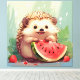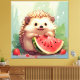 ilustracion encantador de un erizo disfrutando de una sandía. El erizo tiene una expresión feliz, con los ojos cerrados de maravilla, y está rodeado de algunas fresas y hojas. El estilo de sketch de tinta añade un toque caprichoso y bonito a la escena.