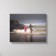 Dos jóvenes chicas juegan al surf en la playa de Bandon, Oregón. Bandon-on-the-Sea es un destino famoso para los fotógrafos que disfrutan de las hermosas estructuras rocosas y de las impresionantes puestas de sol a lo largo de la costa de Oregón.