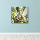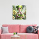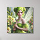 Un hermoso hada de cabello amarillo-verde con alas blancas vestidas con un vestido de bonito y un collar peripunto sostiene un solo gladiolo mientras se encuentra en un campo de gladiolos.