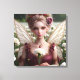Un hermoso hada de pelo buff con alas blancas y de color burgués con un vestido de bonito burdeos y un collar de granate sostiene un clavel blanco mientras se pone de pie en un campo de claveles.
