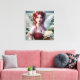 Un hermoso hada de cabello rojo con alas blancas vestida con un vestido rojo bonito y un collar de rubí sostiene una liga de agua mientras está parado en un estanque lleno de nenúfares.
