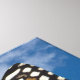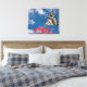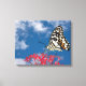 Foto de cierre de una mariposa colorida alimentándose de una flor en un fondo azul del cielo.