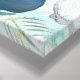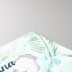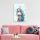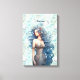 Una hermosa sirena con cabello azul largo y fluido sobre un fondo de teal con un patrón de concha y fronda.