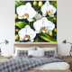Una obra de arte detallada de vibrantes orquídeas blancas complementadas con exuberante follaje verde, mostradas contra un fondo dorado-marrón texturizado, que muestra la elegancia y la belleza de los arreglos florales.