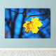Imagen de una sola hoja de arce amarilla en una rama sobre el fondo azul oscuro. Impresión de lienzo único para decorar una pared de una casa o una oficina.
