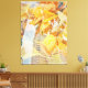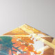 La imagen es una doble exposición con hojas de otoño y una fachada de edificio. Las hojas son predominantemente amarillas y naranjas, lo que sugiere la temporada de otoño. Al fondo se ve un edificio alto con múltiples ventanas parcialmente oscurecido por las hojas. El cielo es azul claro, lo que añade un suave contraste a los tonos cálidos de las hojas. El efecto general crea una composición de ensueño y estratificación.