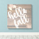 Imprimir Esta preciosa casa de campo de lona impresa presenta una imagen de fondo de madera de granero recuperada, con hojas de otoño en tonos suaves y las palabras "hola otoño". Se puede personalizar con el nombre o mensaje de la familia.