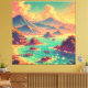Esta impresionante imagen retrata una serena escena costera al atardecer, combinando la arquitectura tradicional japonesa con un vibrante paisaje costero. Los tonos dorados del cielo reflejan las aguas turquesas y brillantes, salpicadas de islotes rocosos y pequeños barcos. A lo lejos, un moderno horizonte urbano descansa sobre majestuosas montañas, creando una armoniosa fusión de naturaleza y vida urbana. El ambiente desprende calidez, nostalgia y tranquilidad
