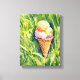 Imaginen un resplandor verde brillante y soleado, las hojas blandas de pasto balanceándose suavemente en la brisa. En el centro se encuentra un cono de helado que se derrite, con sus cremosos remolinos de vainilla y fresa que contrastan con la hierba verde profunda.