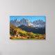 Paisaje de lienzo del pequeño pueblo Sankt Magdalena con la prominente iglesia rodeada de árboles en los colores otoñales frente a los altos picos montañeses de los Dolomitas en la última luz del día en el valle de Villnöss (Funes) en el Tirol del Sur, Italia.