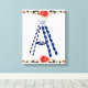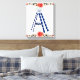 Letra inicial A hecha con imágenes de guijarros de zafiros en corte rectangular, corte de peras y corte marquesa, dentro del corte trapezoide central y adornos cortados de fantasía en el gran zafiro marquesa, acentuado con una flor blanca en la parte superior de la letra A. Sapphire es la piedra de nacimiento de septiembre. El azul es el color del Throat Chakra.