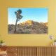 Vista panorámica de un paisaje desértico con un prominente árbol de Joshua en primer plano, sus ramas alcanzando un cielo azul claro. El árbol se erige alto sobre un fondo de rocas escarpadas de tonos dorados, bañadas por el cálido resplandor del sol. La tierra seca y marrón está salpicada de escasa vegetación, lo que crea una sensación de soledad y tranquilidad.