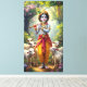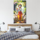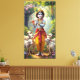 Una pintura vibrante que representa a Lord Krishna, la deidad hindú, como un niño que toca su flauta en medio de un exuberante prado verde con ovejas pastando.