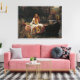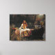 La Dama de Shalott. Este cuadro ilustra el poema de Alfred Tennyson, The Lady of Shalott. Encima del bote está la tela que la señora hizo en una torre cerca de Camelot. Pero ella se maldijo mirando directamente a Sir Lancelot. Con su mano derecha, deja salir de la cadena amarrando el barco. Su boca está ligeramente abierta, mientras canta ‘su última canción’. Ella mira fijamente a un crucifijo tendido frente a ella. Al lado hay tres velas, a menudo usadas para simbolizar la vida. Dos han explotado. Esto sugiere que su vida terminará pronto, mientras flota por el río. John William Waterhouse (1849-1917) fue un pintor inglés pre-Raphaelite que es más famoso por sus pinturas de personajes femeninos de la mitología griega y artruriana. El Waterhouse fue uno de los últimos artistas pre-Raphaelite, siendo más productivo en las últimas décadas del siglo XIX y en las primeras décadas del XX, mucho después de la era de la Hermandad Previoleta. Por esta razón, se le ha denominado "la pre-rapelita moderna", e incorporó en su trabajo técnicas tomadas de los impresionistas franceses.